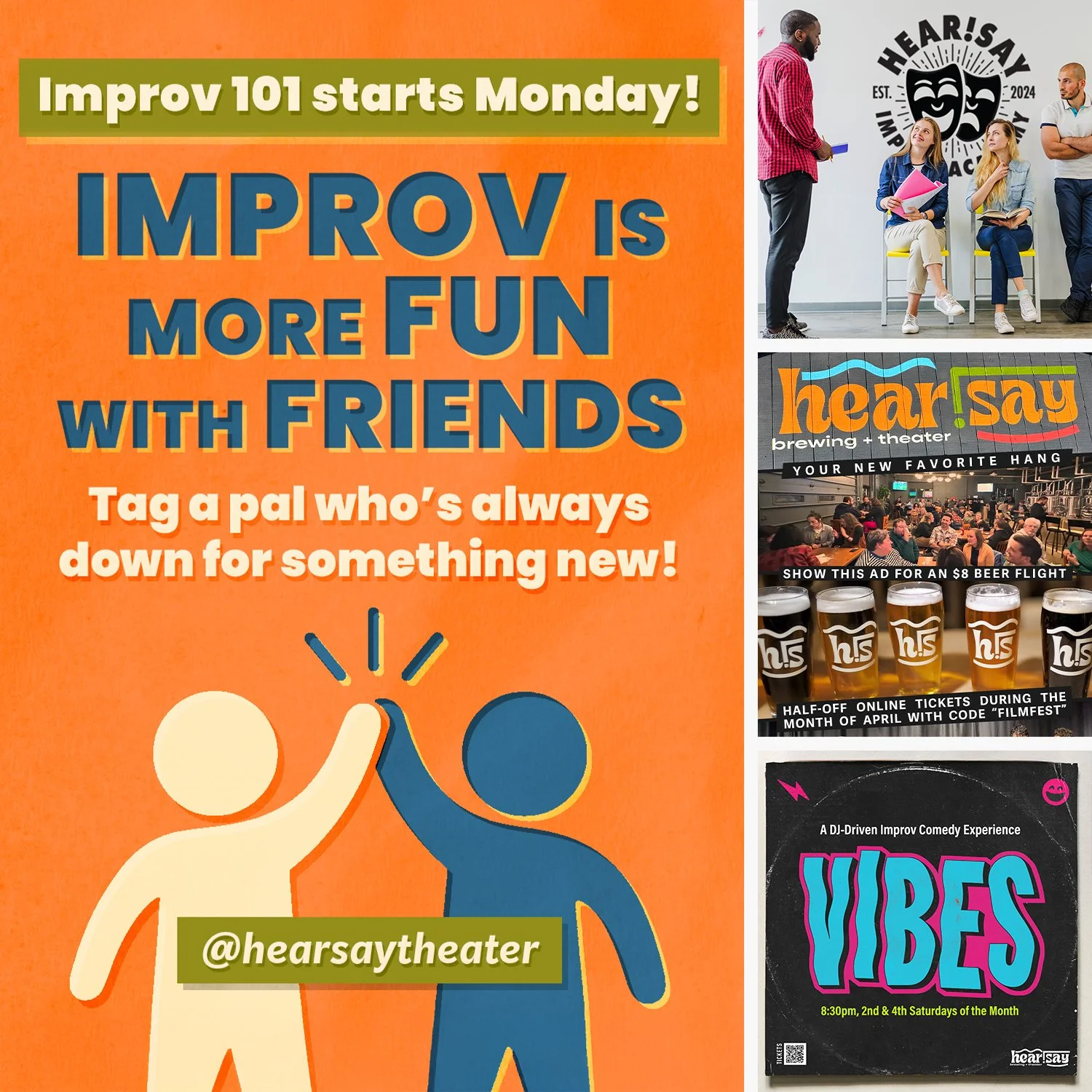 Create promotional design and social media content for hear.say shows and classes, while also teaching and coaching improv through the hear.say academy.