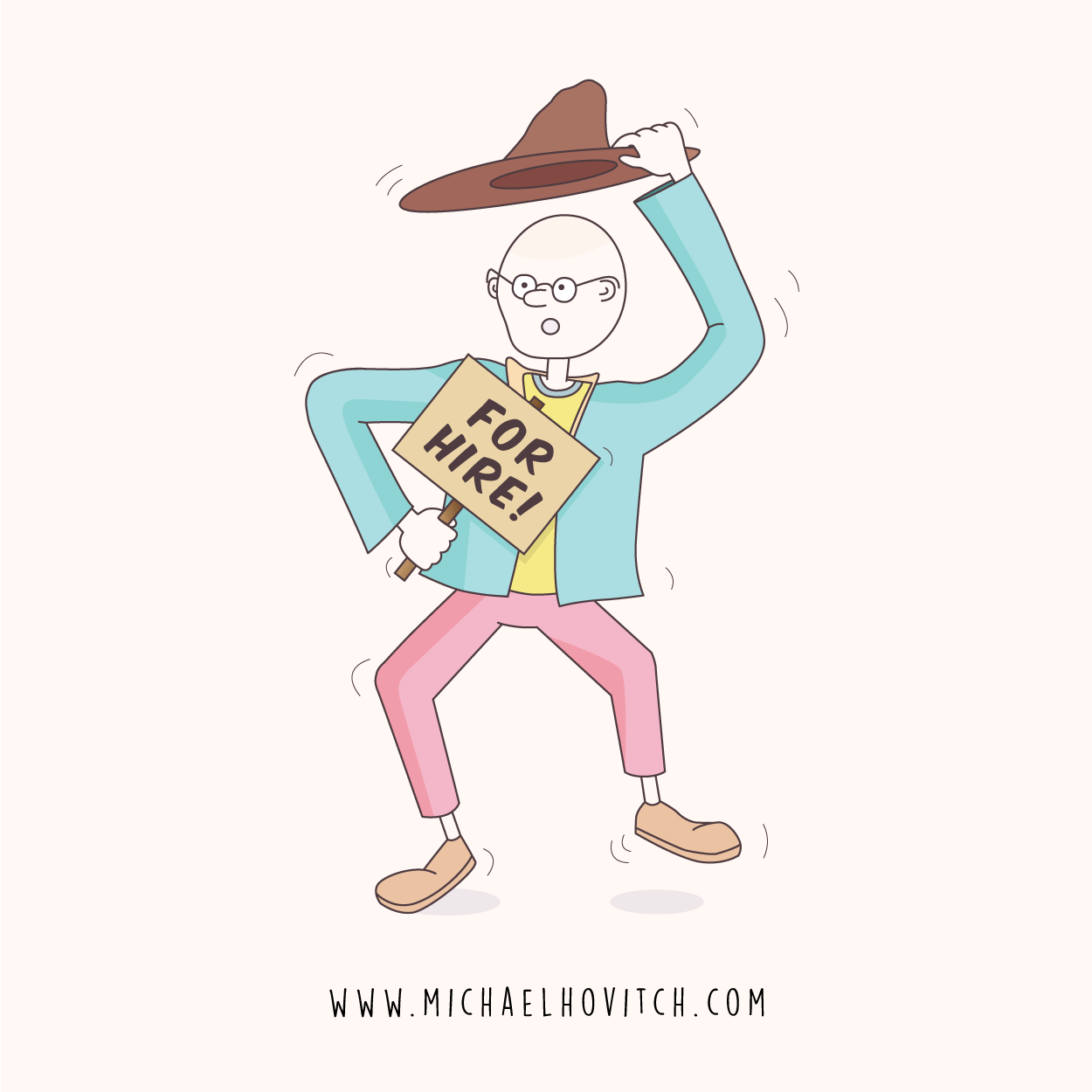 I often start an image like this by drawing using two different colored pencils, one for a rough sketch and the second to refine the image further. The rough color is removed through photoshop color balancing, leaving only the refined lines, then it’s time to drop it into illustrator to recreate the character in vector form. Finally, the image is completed with the addition of color. Viola, a Dancing Fool is born!
